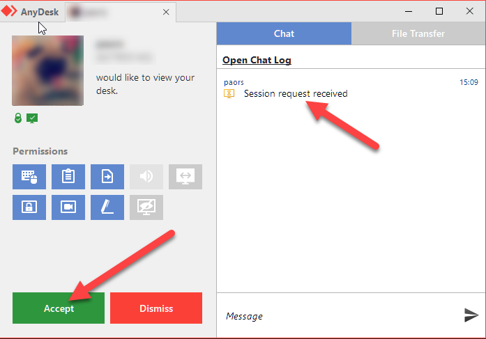 La persona de helpdesk enviará un requerimiento de conexión, y el usuario verá un "Session Request received", debe darle a "Accept" para que la persona de IT pueda conectarse.