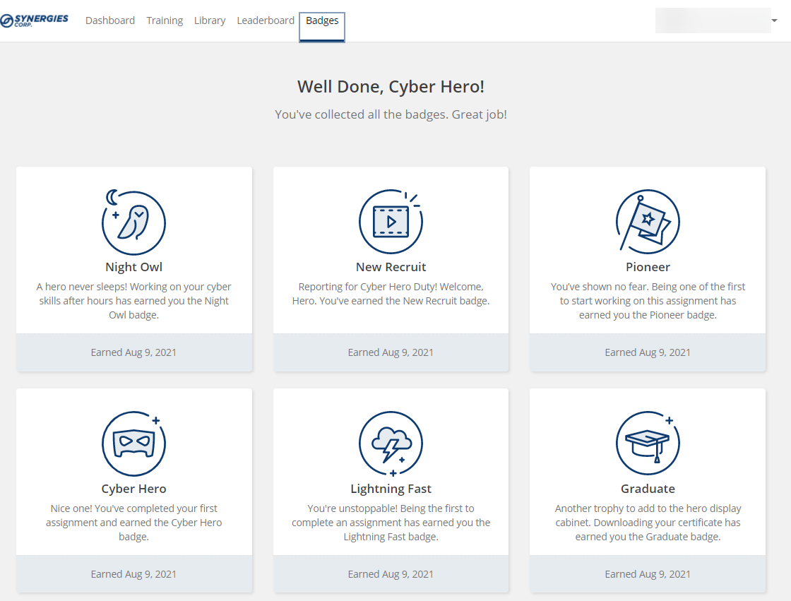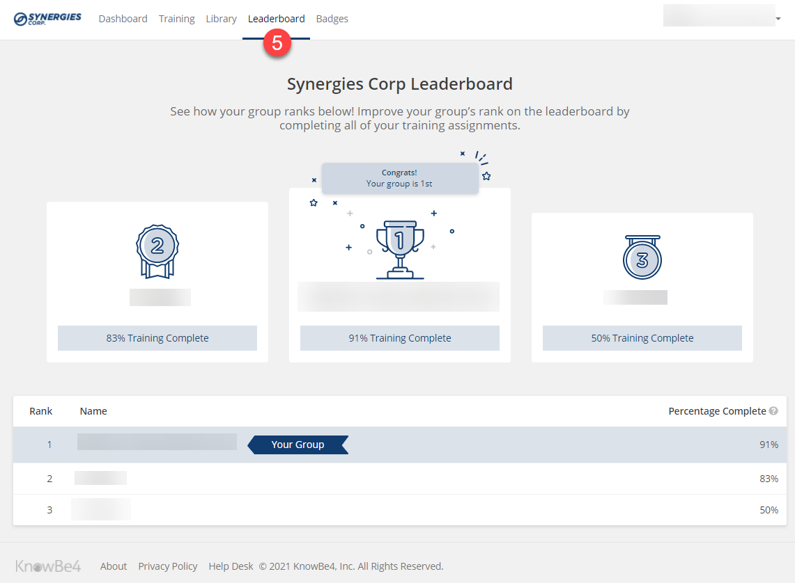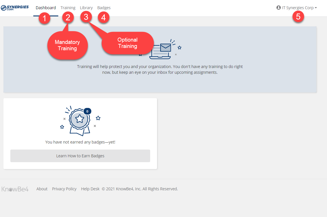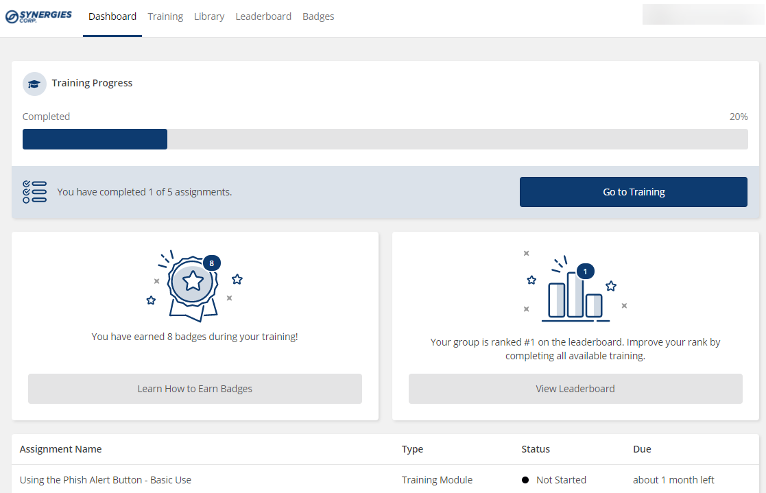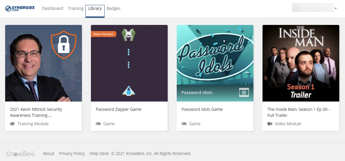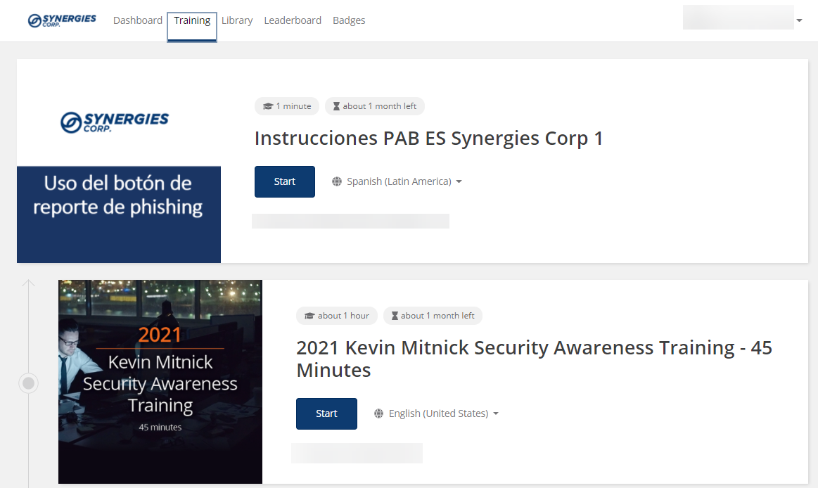 - Library/Biblioteca: Aquí aparecen los entrenamientos que son opcionales. Lo que hagas aquí no cuenta para tu puntuación ni para lo de tu equipo. Si en algún momento un entrenamiento opcional pasa a ser mandatorio, aunque lo hayas hecho, deberás hacerlo nuevamente ya que contará para tu puntuación. De igual manera, si fallas en pruebas de phishing o se identifica que necesitas refrescar alguna información, un entrenamiento podría asignársete nuevamente.