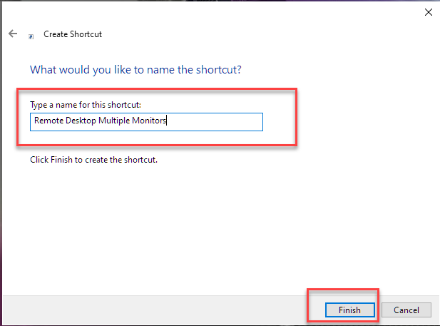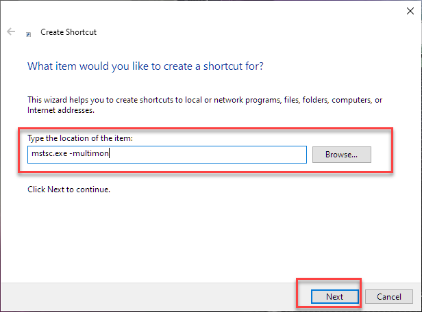 - En donde dice "Type the location of the item", escribir: mstsc.exe -multimon